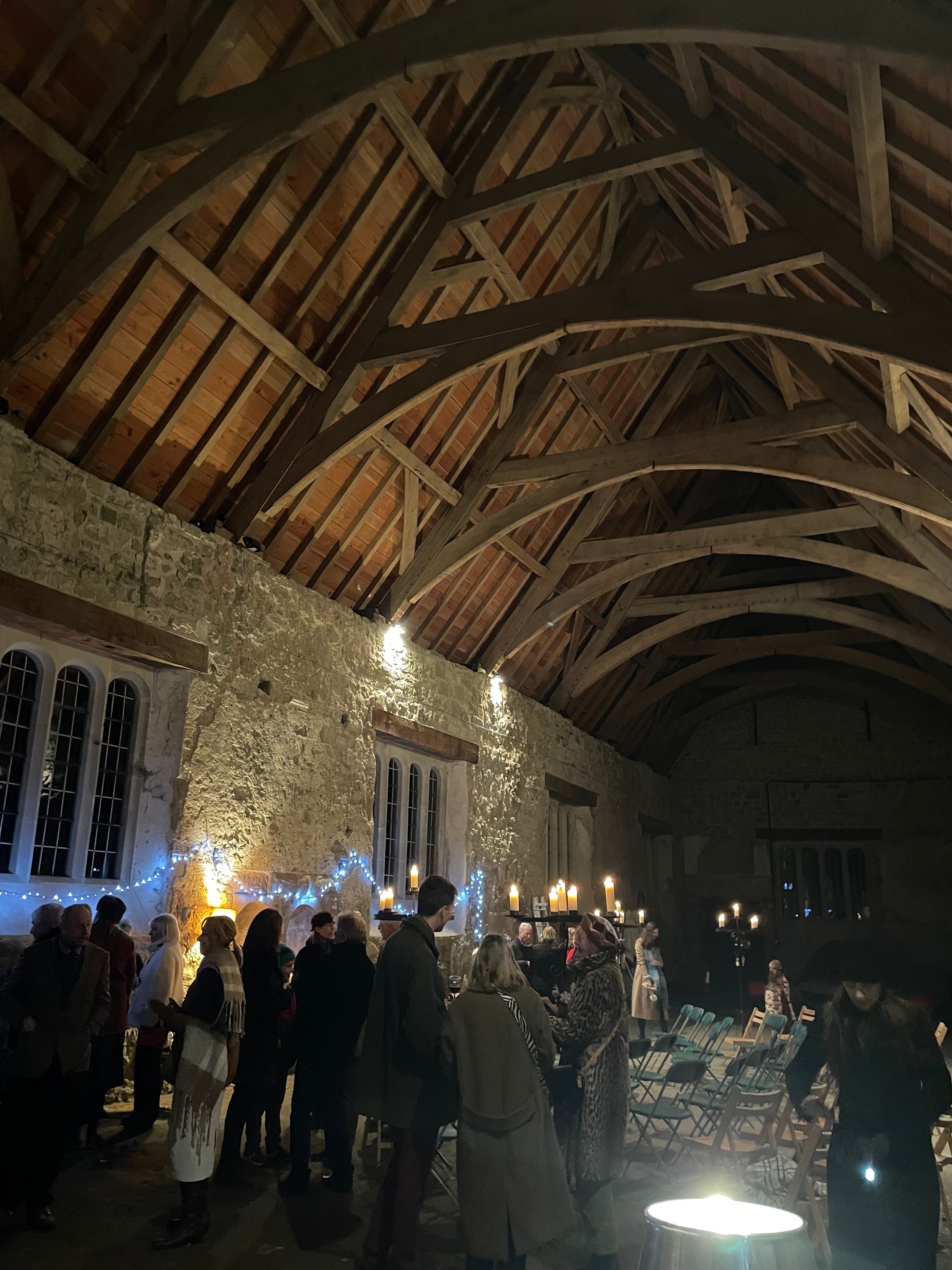 Two large candlestands brought from the church flickered welcome, and the chairs were arranged in a semi-circle, so our vicar was no more than two yards away, and we could see him and each other easily. The building was otherwise rather dark, and cold, the floor even more so. This gave a certain briskness to the proceedings. We did not hang about in our observances. Closer together, we belted out the carols. The lessons were well read. Eliot’s “The Journey of the Magi” was one of the readings. (“Much better than my giving a sermon” said the vicar to me later).