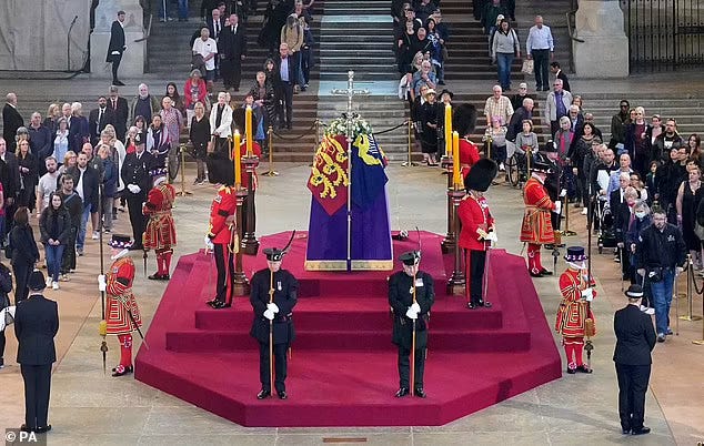 All very British. Few nations have a 900-year-old hall as the centre of government, and the collection of mediaeval, Tudor and 19th Century uniforms to recall their military and cultural histories. Few have the same head of government for 70 years. No music, no trumpets, no popcorn. Just a procession of the public, mute. Sovereigns have died before, and will die again, but this is happening now, in the lives of the respectful cortege, and they wish to be on the record as having made their farewells.